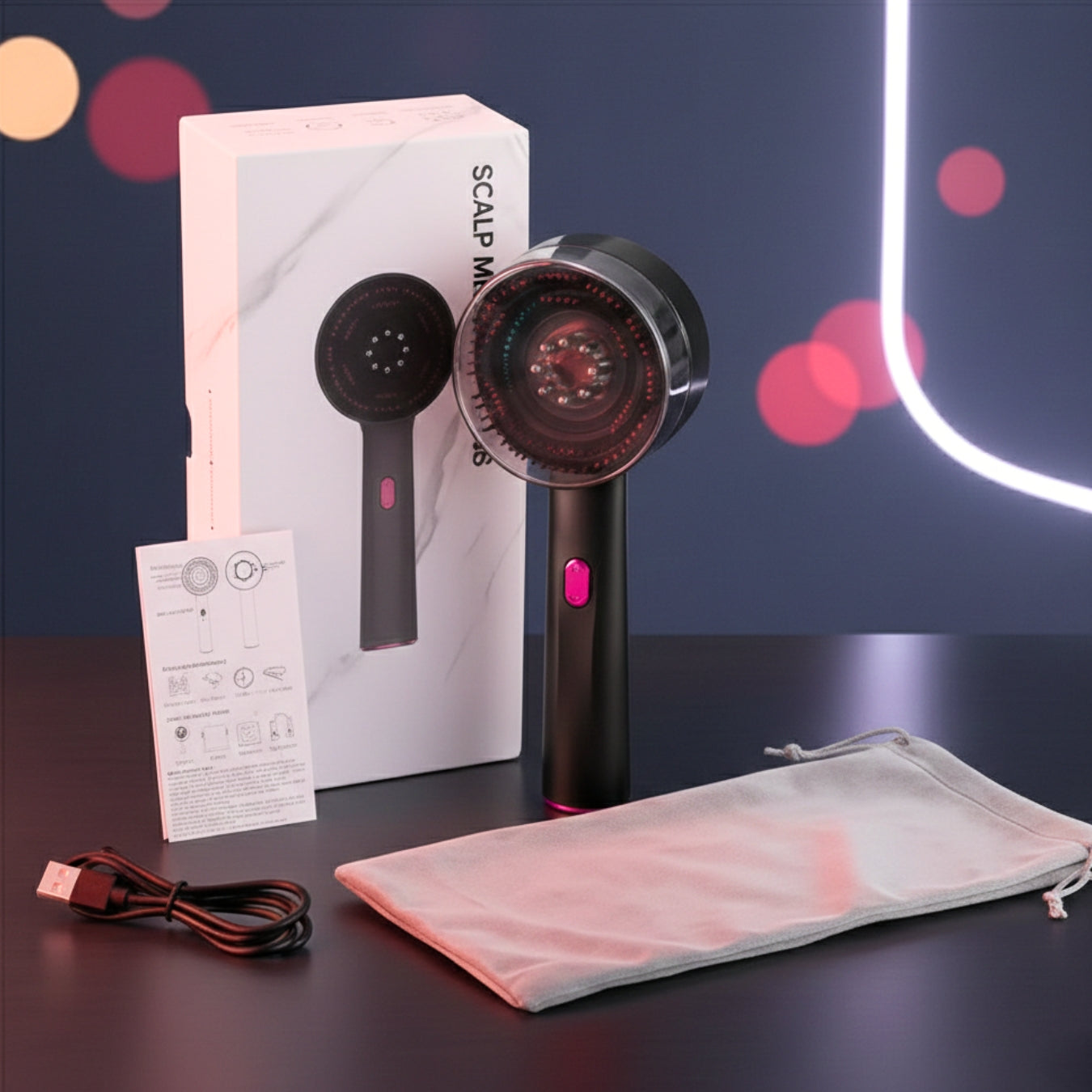 Incluye el cepillo masajeador capilar, cable de carga USB, bolsa de guardado y manual/guía de uso. (Los packs u ofertas por 2 o 3 unid. vienen con sus complementos completos.)