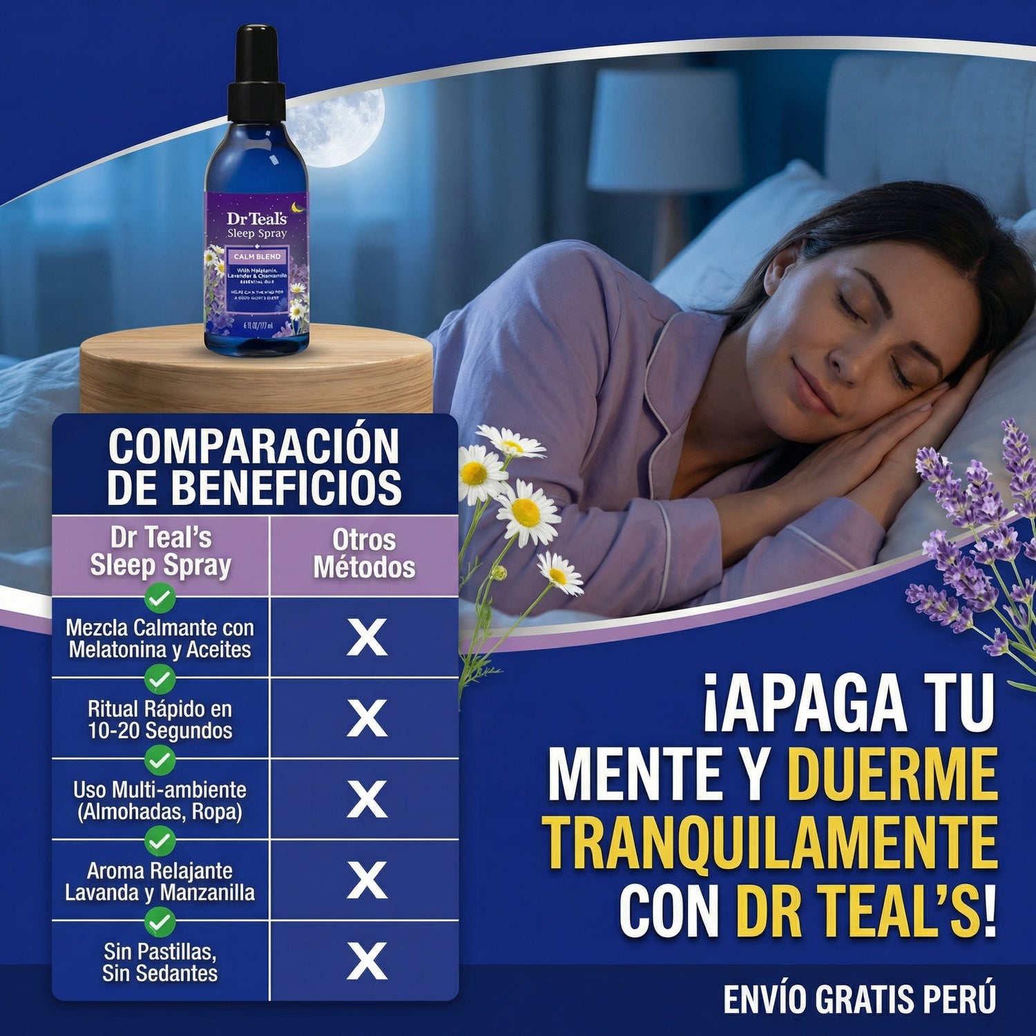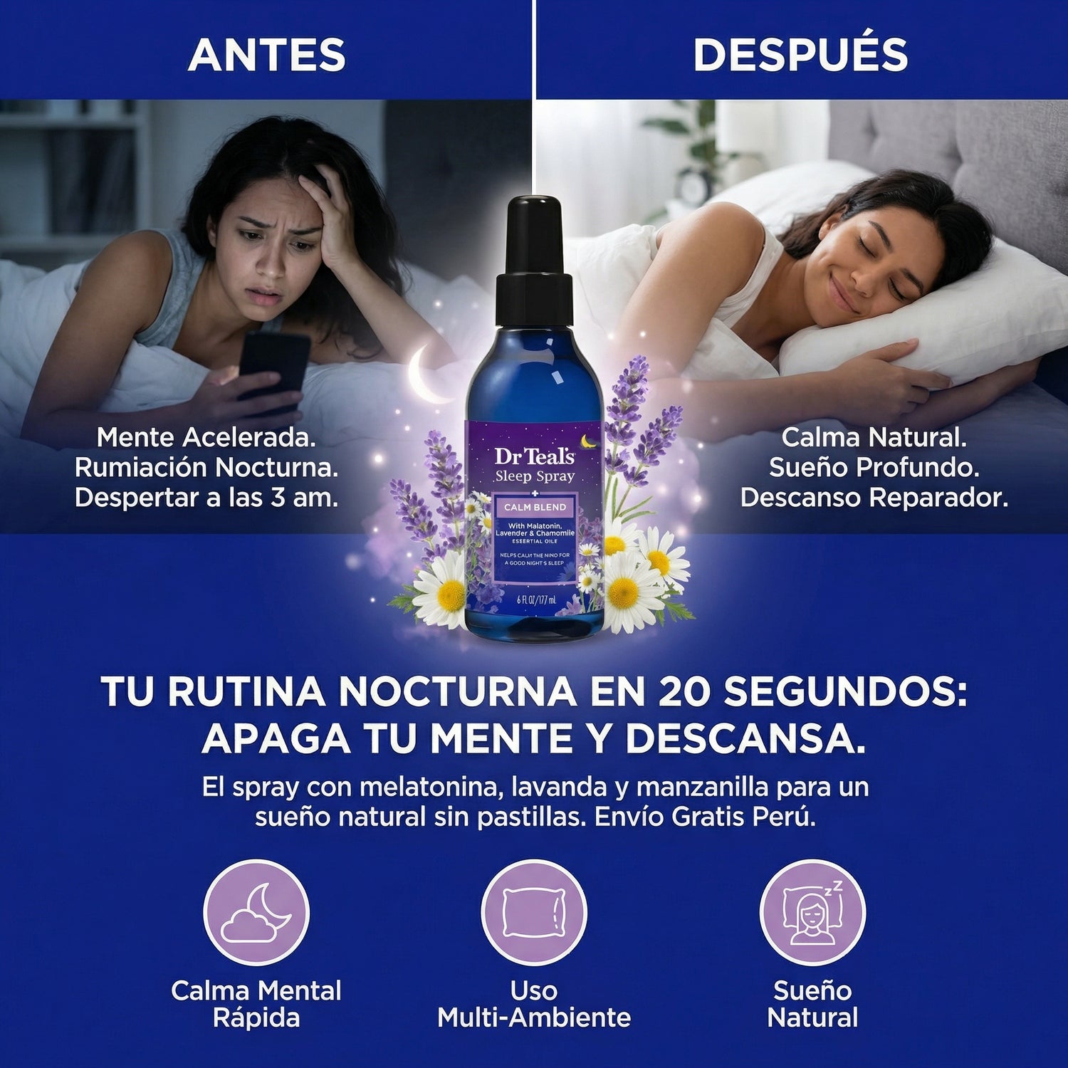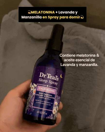 Imagina acostarte y no sentir ese temor de “otra vez voy a quedarme despierto/a”. Dr Teal’s Sleep Spray hace que tu rutina sea más agradable, más calmada y más constante, justo lo que necesita alguien que ya está cansado de “métodos” que no duran. Diseñado para convertirse en tu señal nocturna: MELATONINA + el aroma de lavanda y manzanilla ayudan a que tu cuerpo entre en modo descanso.